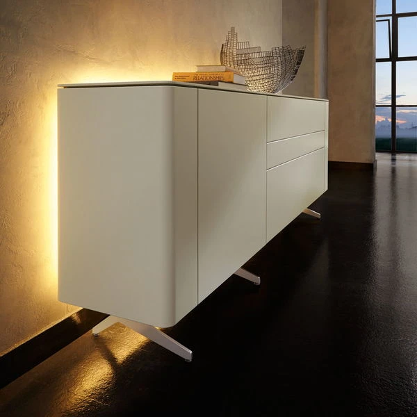 Für dieses hülsta Gentis 3R Lowboard ist die Installation einer indirekten Beleuchtung möglich (siehe Foto). Diese besteht aus einem Funktionsrahmen (Holz weiß) und der entsprechenden LED-Beleuchtung für den Funktionsrahmen. Gesteuert wird die Beleuchtung über eine 4-Kanal-Funkfernbedienung mit Farbtemperaturwechsel (kaltweiß – 6500K bis warmweiß – 2700K).