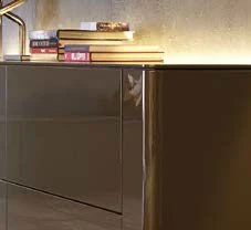 Die gerundeten Elementabschlüsse der Lowboards können gegen Aufpreis wahlweise mit Auszügen oder Drehtüren ausgestattet werden. Bei den Drehtüren muss der seitliche Abstand 27 cm (je Tür) betragen, um die Türen vollständig öffnen zu können.