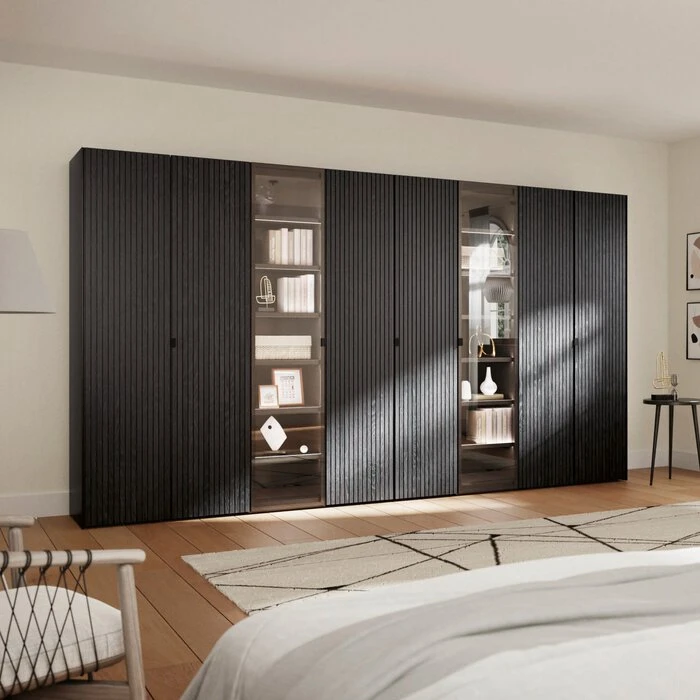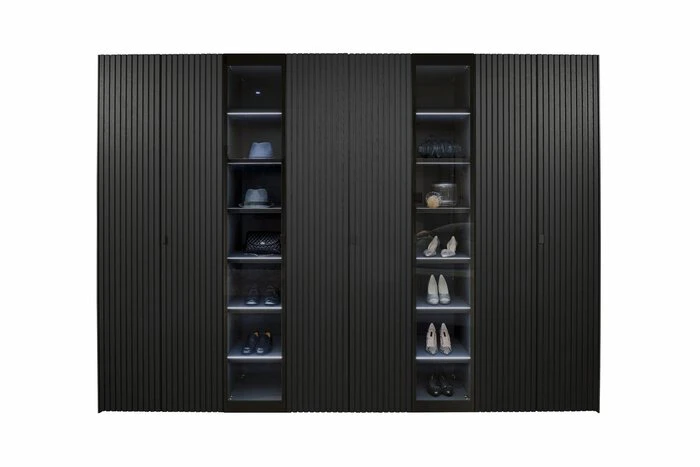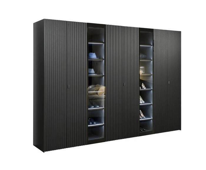 - Innenausstattung: 2 Fachböden und 1 Kleiderstange je Türenelement (Lamelle), 6 Fachböden mit Beleuchtung je Glastürenelement
