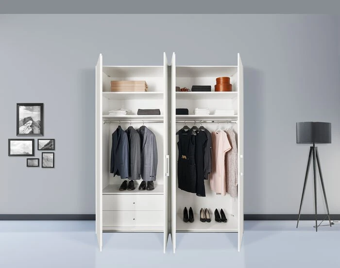 - Innenausstattung: 2 Fachböden und 1 Kleiderstange je Türenelement, zusätzlich 1 Schubkasteneinsatz mit 2 Schüben