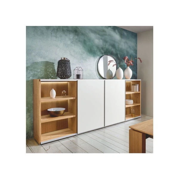 Die now! time by hülsta Kombination 3 in Natureiche/Lack-weiß ist ein Sideboard mit Schiebetüren, hinter denen ein Fernseher versteckt werden kann.