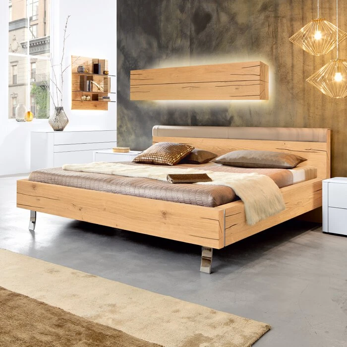 - Inklusive Kopfteil mit Polsterapplikation aus Nappaleder in sand