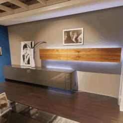Wohnwand Gentis Lack Hochglanz Grau Mit Akzenten Kernnussbaum Naturstamm Mit Beleuchtung