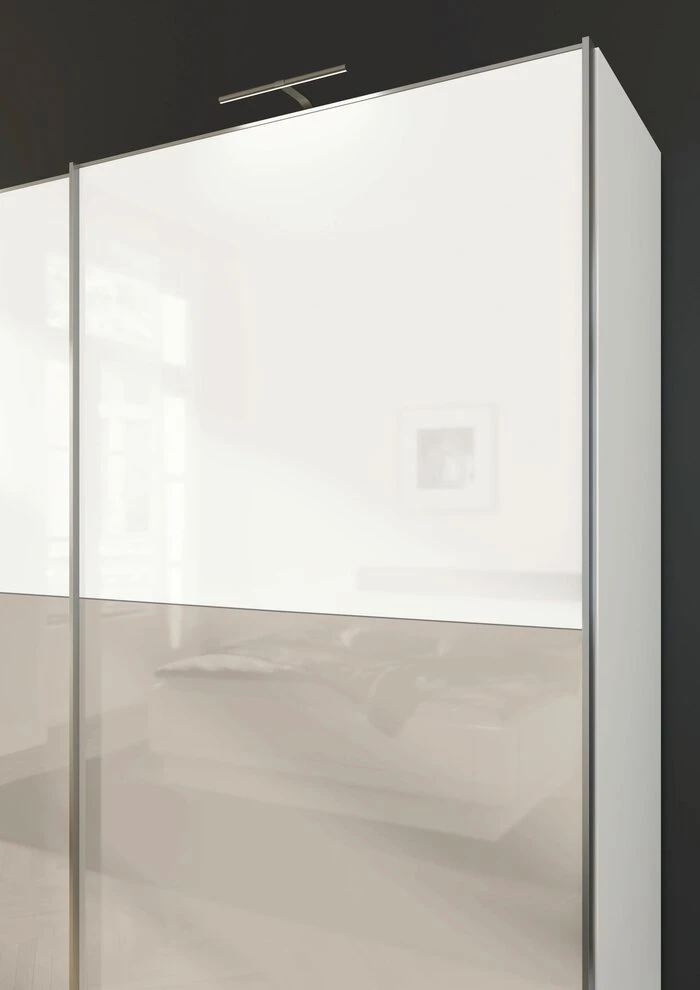 - Front aus Spanplatte, obere Türenfelder mit Lack in reinweiß Hochglanz, untere Türenfelder mit Lack in kaschmir Hochglanz