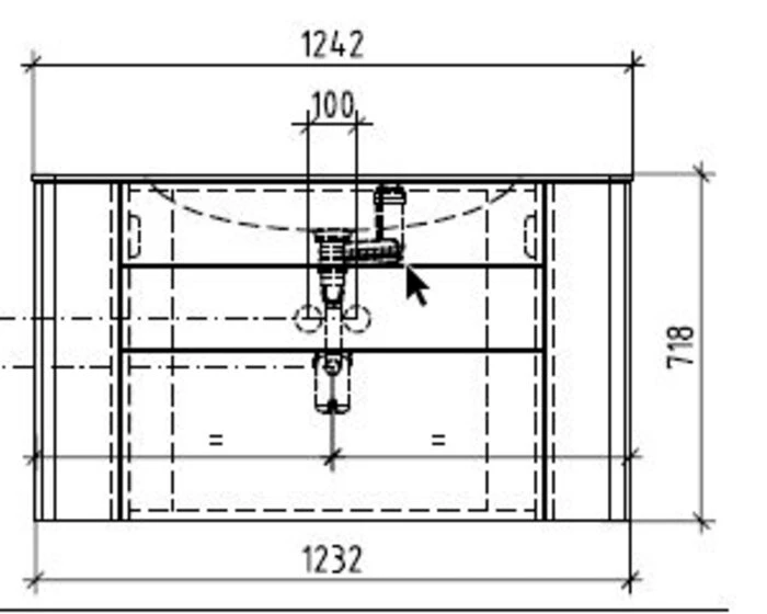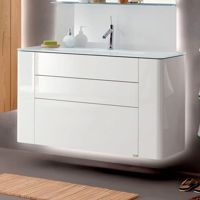 - Mit Waschtischunterschrank, 1 feste Blende, 2 Schubladen, links und rechts 1 Auszug, mit LED-Beleuchtung 15,6 Watt