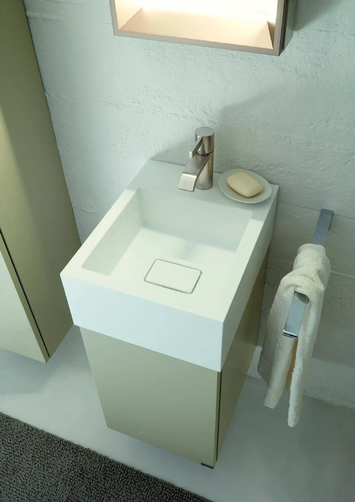 - Bestehend aus Waschtischunterschrank mit 1 Tür und 1 Einlegeboden und Corian Waschtisch in Weiß